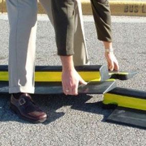Without the need to bolt down these speed bump units, these traffic calming products can be temporarily deployed and easily recovered whenever and wherever you need them. The unique design of these speed bumps means that they will stay in place without the use of stakes, bolts, or adhesives. Simply put them down and link them together! The MLSB4 Speed Bump provides you with 4 INCHES of solid, 100% recycled rubber which is manufactured to withstand extreme temperatures, constant U.V. light, extreme weather conditions, and of course, high traffic volume. Designed to slow traffic to 3-5 mph. The MLSB4 has been repeatedly field-tested to take the abuse and compression of extremely high-weight vehicles, including fully-loaded, 74,000 lb tractor-trailers. These qualities make the MLSB4 Speed Bump ideal for temporary traffic stops, guarded gate entrances or exits, construction sites, or anywhere a more aggressive traffic control device is temporarily needed. This speed bump has been successfully used by police and fire departments as well as Border Patrol and Military Units for check points. The MLSB4 Speed Bump comes with a high-visibility, yellow reflective stripe for use during low-light or night-time conditions. 3 units are easily deployed to cover a 10 ft wide traffic lane. More units give you unlimited length and coverage.